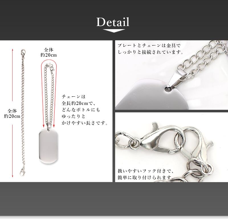 サイズ プレート: 縦約49mm 横約28mm/リング: 約10mm/チェーン: 約200mm